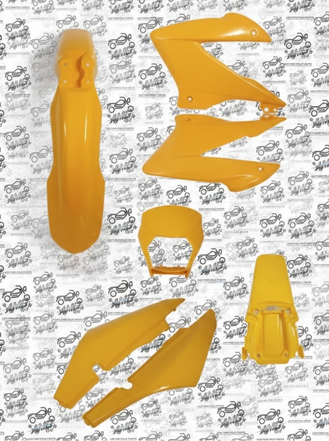 با تعویض آسان فلاپهای کهنه، ظاهر موتورسیکلت تریل خود را به رنگ زرد جذاب و پرانرژی تغییر دهید. این ست کامل، مقاوم و کاملاً فابریک است.
